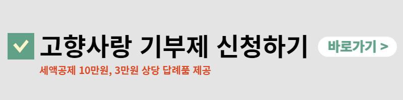 정부에서는 지방재정 확보를 위해 타 지역에 기부를 하면 세액공제를 해주고 답례품을 제공하는 제도를 도입했습니다. 기부금 10만원까지는 전액 세액공제되며, 초과 시 16.5% 공제됩니다. 또한 기부금의 30%에 해당하는 답례품까지 제공한다고 하니, 10만 원 기부하고 세액공제와 답례품까지 받아가시기 바랍니다.
