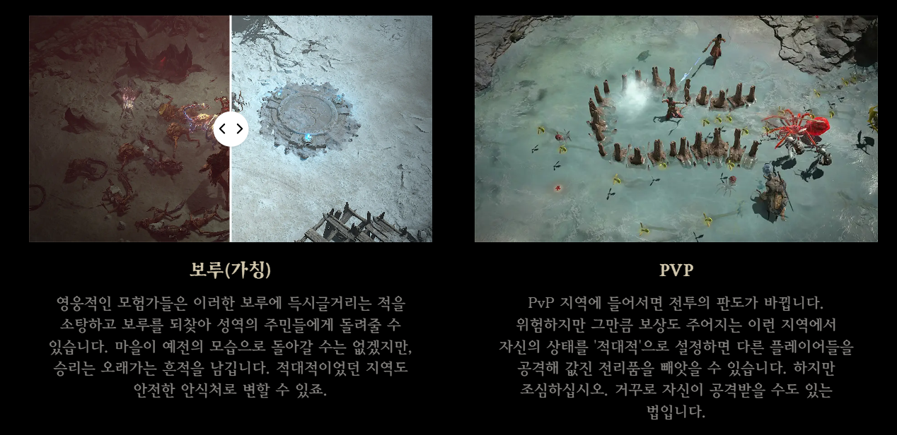 또한, 메피스토의 저주 지역에서는 PvP가 가능합니다. PvP를 통해서 형상변환 아이템 및 트로피를 획득할 수 있지만 추가 능력치는 획득할 수 없습니다. 전작인 디아블로2와 동일하게 이긴 상대방의 귀를 획득할 수 있습니다.