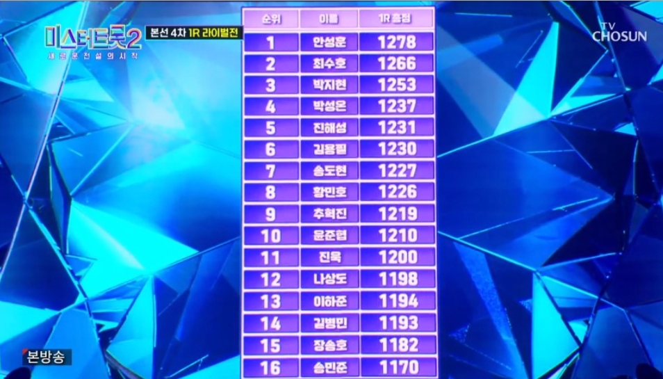 본선 4차 TOP10 결정전 1라운드에서는 안성훈이 1위를 차지하며 2위 최수호, 3위 박지현, 4위 박성온, 5위 진해성, 6위 김용필, 7위 송도현, 8위 황민호, 9위 추혁진, 10위 윤준협, 11위 진욱, 12위 나상도, 13위 이하준, 14위 길병민, 15위 장송호, 16위 송민준 순으로 결정됐습니다. 다가오는 방송에서 2라운드 마지막 대결을 통해 TOP 10 최종 인원이 선발될 예정입니다.