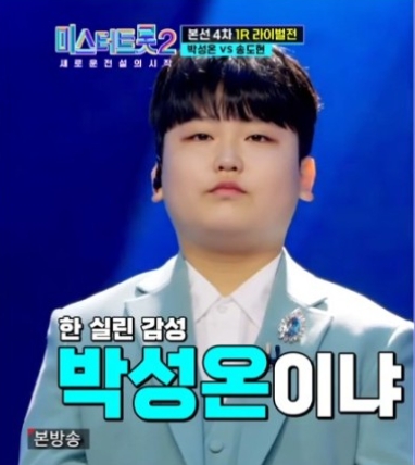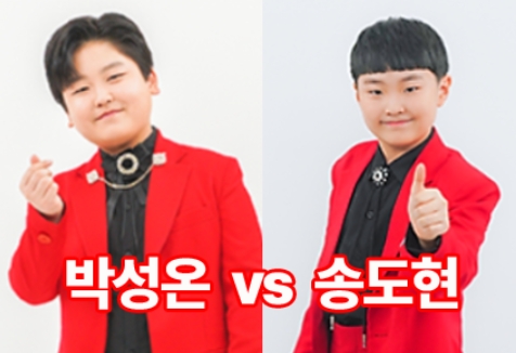 다음 라이벌조는 박성온과 송도현의 어린이 대결입니다. 박성온이 먼저 송가인의 '비 내리는 금강산'을 불러 역시 어린이 답지 않은 깊은 호소력을 보여주며 특기인 한 실린 감성을 잘 표현했습니다.