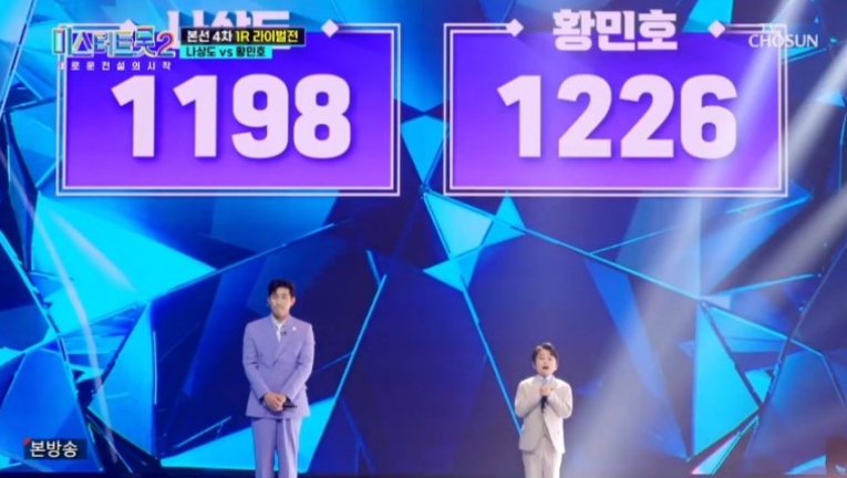 나상도는 진성의 '내가 바보야'를 부르며 묵직한 울림을 담아 노래했고, 황민호는 김추자의 '님은 먼 곳에'를 선곡하여 폭풍 가창력을 보여줬습니다. 이번에도 역시 소름 돋는 무대를 보여준 황민호가 1226점을 얻으며 1198점을 얻은 나상도를 제치고 승리를 거둡니다..
