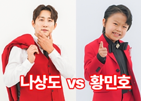 1라운드의 마지막 대결은 나상도와 황민호의 대결입니다. 10살의 황민호와 38살의 나상도는 28살의 나이차이가 나는데요, '미소천사' 나상도는 현재 인기투표 3위에 랭크 중이며 큰 인기를 얻고 있습니다. 황민호 역시 어린이 참가자 중 가장 돋보적인 실력을 자랑하며 두 사람의 대결에 팬들은 큰 기대를 하게 됩니다.