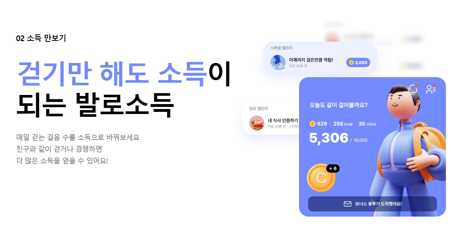 평범한 일상 중 소소한 작은 습관들을 통해 소득을 얻게 해주는 앱테크 어플입니다. 소득을 얻는 방법은 크게 두 가지가 있습니다. 첫 번째는 발로소득이라는 이름답게 걸음수에 따라 코인을 지급하는 '소득 만보기' 기능입니다. 두 번째는 하루의 일상을 사진으로 찍어 올려서 미션을 수행하는 '일상 챌린지' 기능이 있습니다.