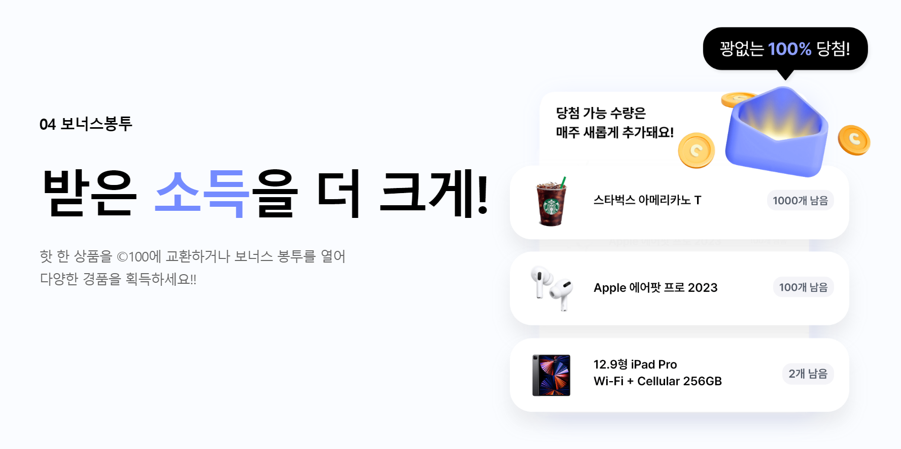 현재 발로소득에서는 스타벅스 아이스 아메리카노 톨사이즈가 6,429 코인으로, 매주 1600 코인씩 4주를 모으면 6400 코인으로 아메리카노를 공짜로 먹을 수 있습니다. 이 외에도 각종 챌린지를 통해 스타벅스, 맘스터치, 도미노 피자 등의 브랜드 쿠폰 추첨도 진행하고 있습니다.