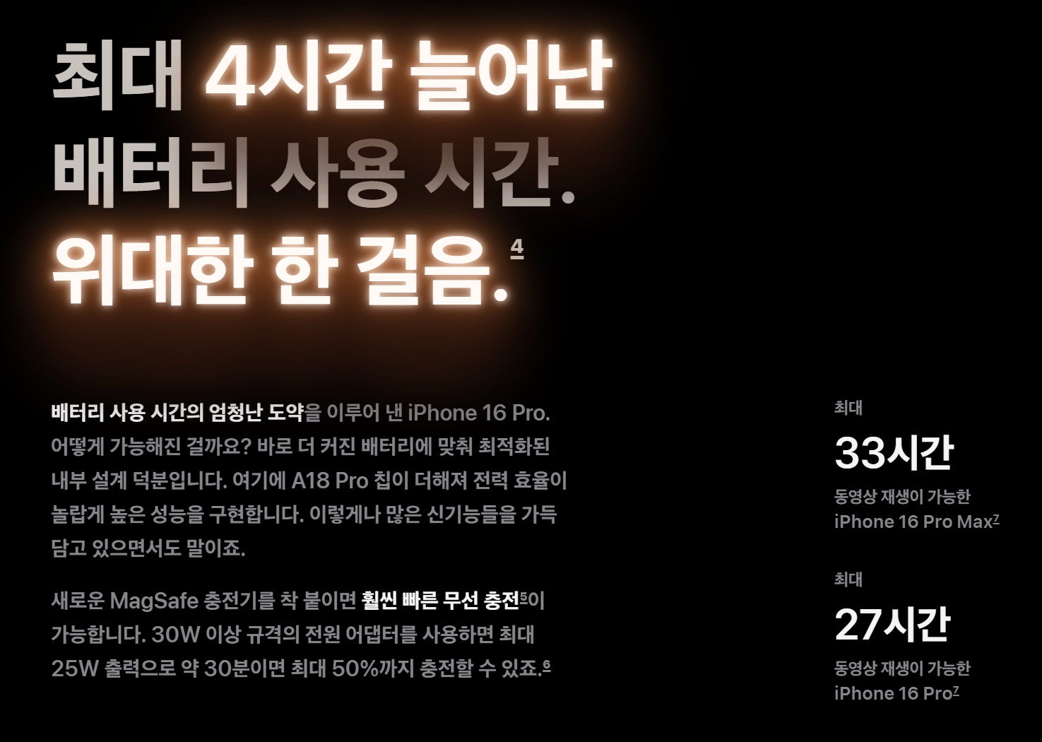 - 배터리 효율 향상: A18 칩의 효율성 향상으로 배터리 사용 시간이 늘어나 하루 종일 스마트폰을 사용하더라도 충분한 배터리 용량을 유지할 수 있습니다.
