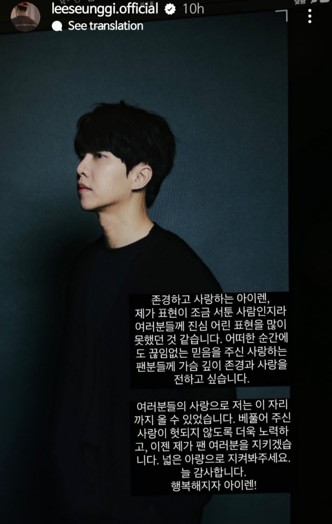 이승기는 결혼 발표 후 여론이 너무 안좋아지나, 인스타그램을 통해 다시 한번 두 사람의 결혼에 축복을 빌어줄 것을 부탁했습니다. 이승기는 지난 18일, 자신의 팬들을 향해 "어떠한 순간에도 끊임없는 믿음을 주신 사랑하는 팬분들께 가슴 깊이 존경과 사랑을 전하고 싶다"며 자신의 마음을 알렸습니다. 이승기는 "넓은 아량으로 지켜봐 달라"며 현재 부정적인 대중의 인식을 바꾸고자 노력 중입니다.