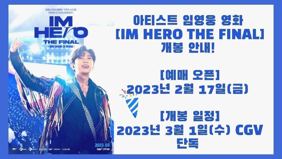 임영웅은 23년 3월 1일부터 전국 CGV를 통해 2022년 전국투어 앙코르 공연의 순간을 기록한 영화 '아임 히어로 더 파이널(IM HERO THE FINAL)개봉도 앞두고 있습니다. 극장에서 다시 한번 임영웅 콘서트의 감동을 재현할 수 있는 기회입니다. 2월 21일 화요일부터 CGV 홈페이지와 모바일 APP을 통해 예매할 수 있습니다.
