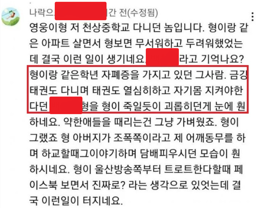 황영웅이 괴롭힌 자폐학생의 실명까지 거론하며 황영웅의 행태를 비판했으며, 황영웅이 자신의 아버지가 조폭이라 말하며 담배를 피웠다는 사실과 함께 약한 친구들을 괴롭혔다고 주장했습니다. 특히 제보자는 황영웅이 트롯 방송에 나가며 동내 곳곳에 현수막이 붙은 것을 보고 정말 기가 막히다며 제발 나락으로 떨어져 달라며 댓글을 남겼습니다.
