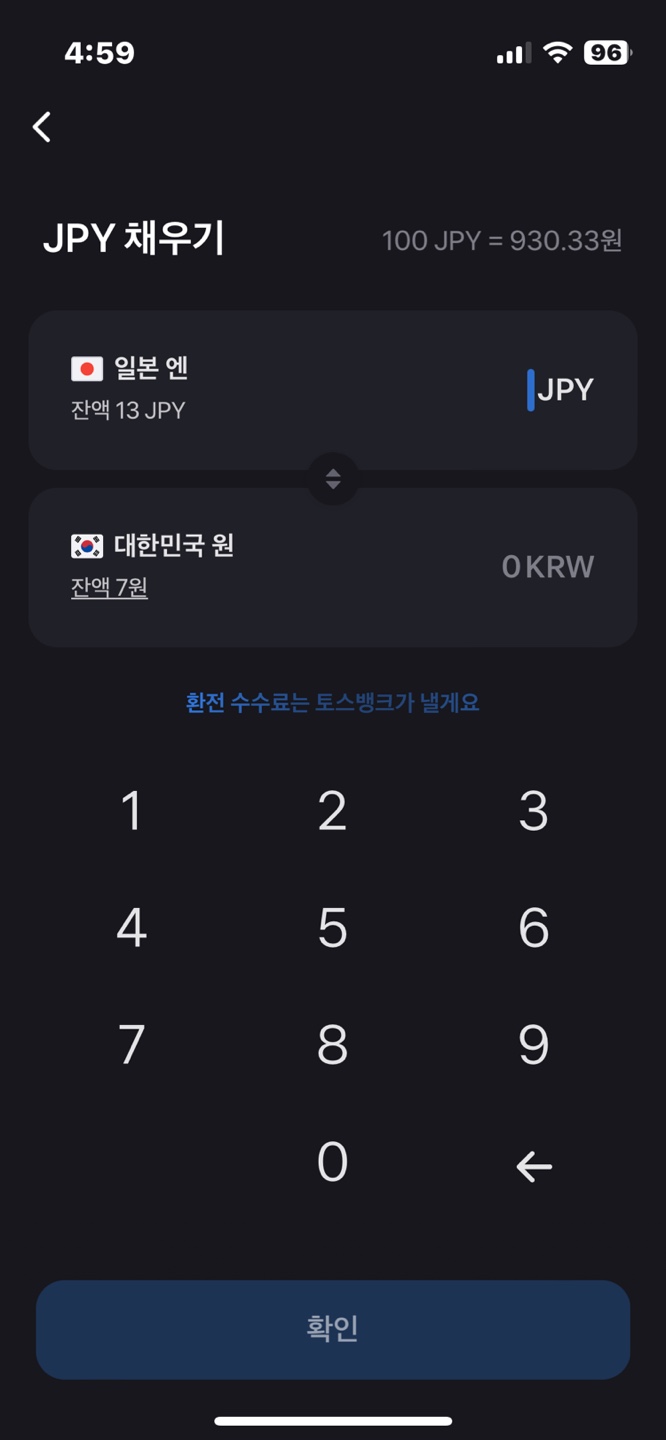 5. '확인' 버튼을 누르면 즉시 엔화로 환전됩니다.