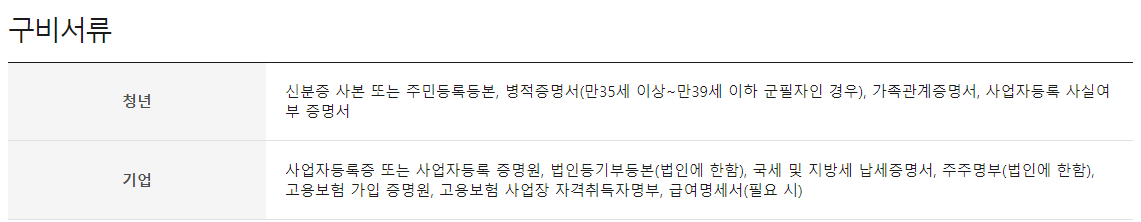 신청시에는 구비서류도 필요합니다. 청년은 신붕증 사본이나 주민등록등본 및 병적 증명서, 가족관계증명서 등을 제출해야 하며 기업은 사업자등록증 및 법인등기부등본, 국세 및 지방세 납세 증명서, 주주명부 등을 제출해야 합니다.