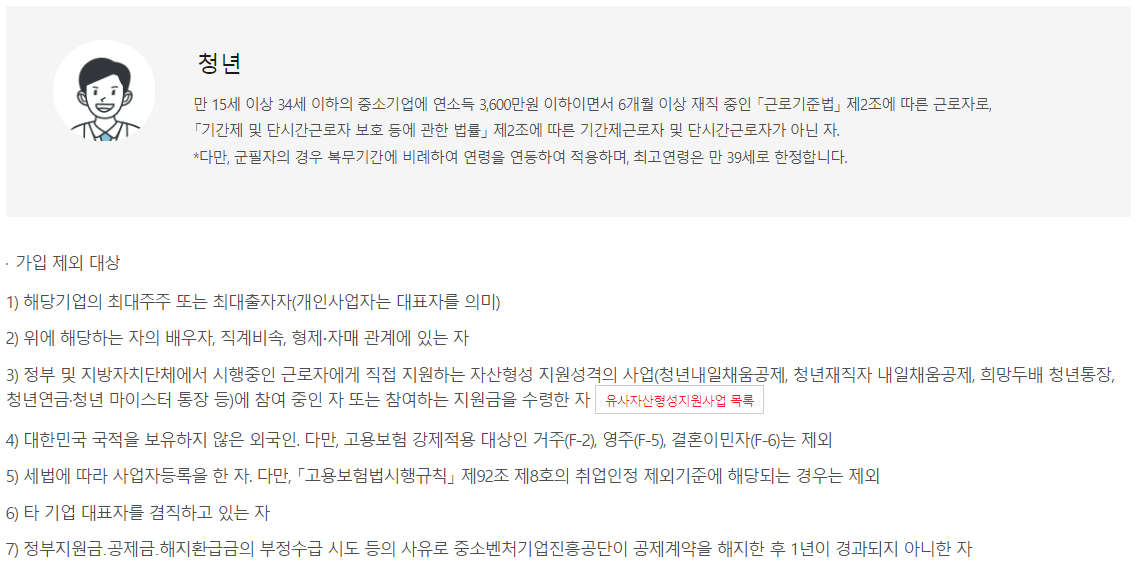 또한 청년내일채움공제, 청년재직자 내일채움공제 등 유사한 정부지원 제도에 참여 중이거나 이미 참여하여 지원금을 받은 사람은 지원할 수 없습니다.