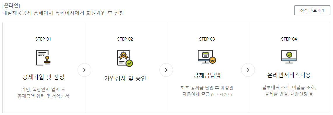 청년재직자 내일채움공제 플러스는 내일채움공제 홈페이지에서 온라인으로 신청할 수 있으며 중소벤처기업진흥공단 지역본지부에서 오프라인으로 신청할 수도 있습니다. 온라인 신청 시 내일채움공제 홈페이지에서 회원가입 후 공제가입 및 신청 후 승인절차를 거쳐야 합니다.