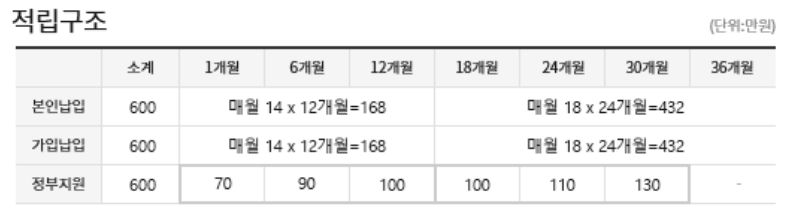 | 납입비율 | 쳥년:기업:정부 = 720 : 1,200 : 1,080만원 |