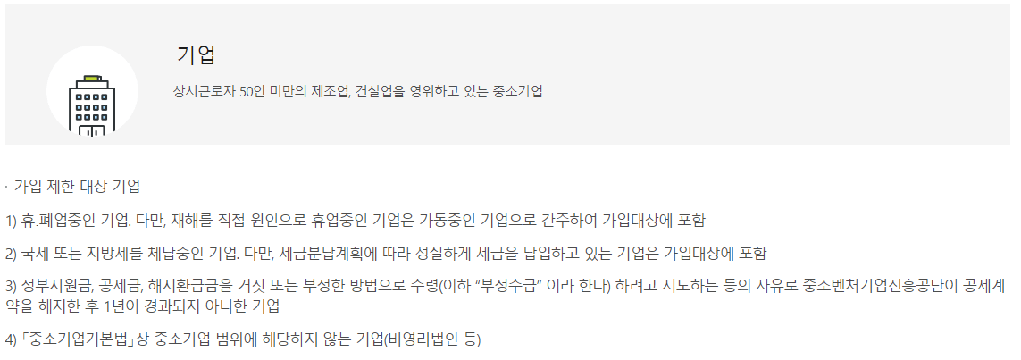 상시근로자가 50인 미만이며 제조업, 건설업을 영위하고 있는 중소기업이 지원대상입니다. 휴, 폐업 중인 기업은 가입대상에서 제한되며 세금을 체납 중인 기업도 제외됩니다.