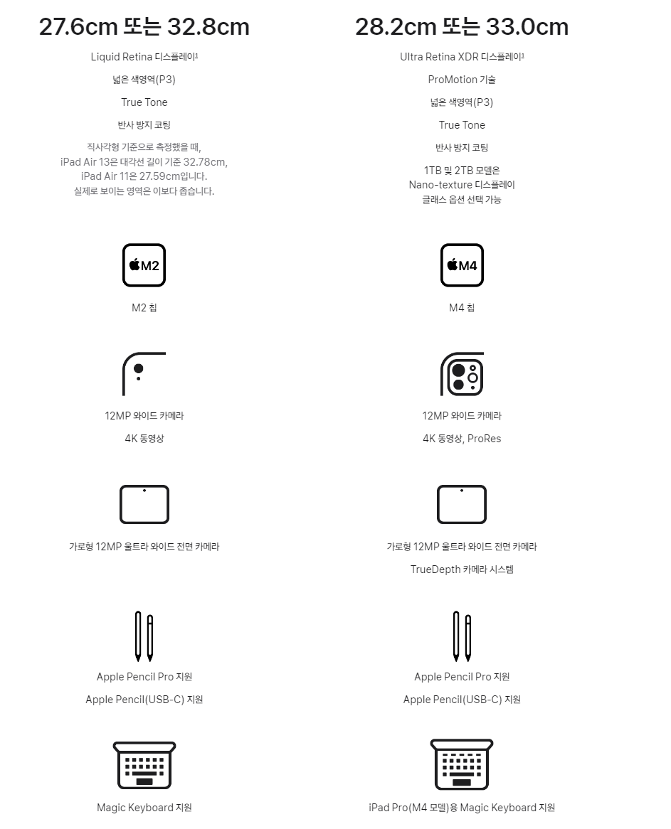 - 칩셋: 아이패드 프로는 M4 칩을, 에어는 M2 칩을 탑재했습니다. M4가 더 강력한 성능을 발휘하지만, M2 역시 대부분의 작업에 충분한 수준입니다.